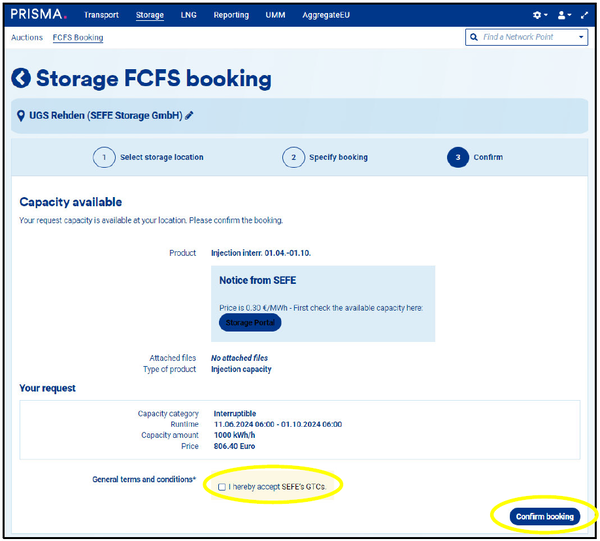 5. Another click on [Check availability] sends a binding capacity request to the SEFE Storage system to reconfirm the availability of the capacity. If the requested capacity is available, the system will return an identical booking proposal. If the requested capacity is not fully available, the system will suggest the maximum available capacity.